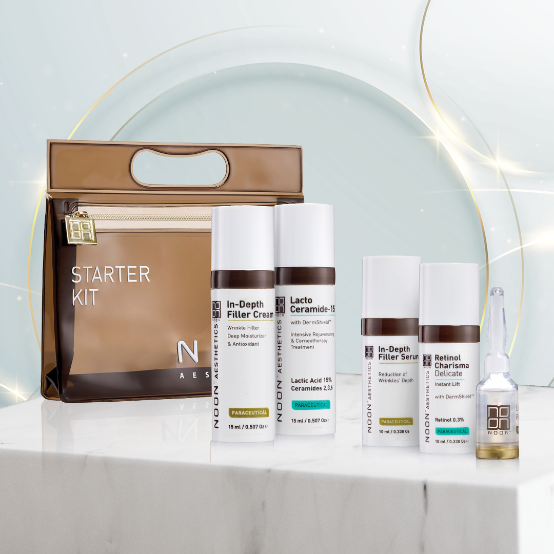 Îngrijire profesională la tine acasă: kit-ul Noon Anti-Aging include produse de înaltă performanță cu ingrediente active atent selecționate, care completează cu succes tratamentele efectuate în cadrul clinicilor de specialitate. Efecte benefice garantate de rejuvenare a pielii – anti riduri și imperfecțiuni ale pielii, împotriva pierderii hidratării, tonifierii și elasticității pielii. Substanțele precum retinol, AHA și peptide bio-mimetice sunt adjuvante prețioase împotriva trecerii timpului și menținerii sănătății și frumuseții pielii.